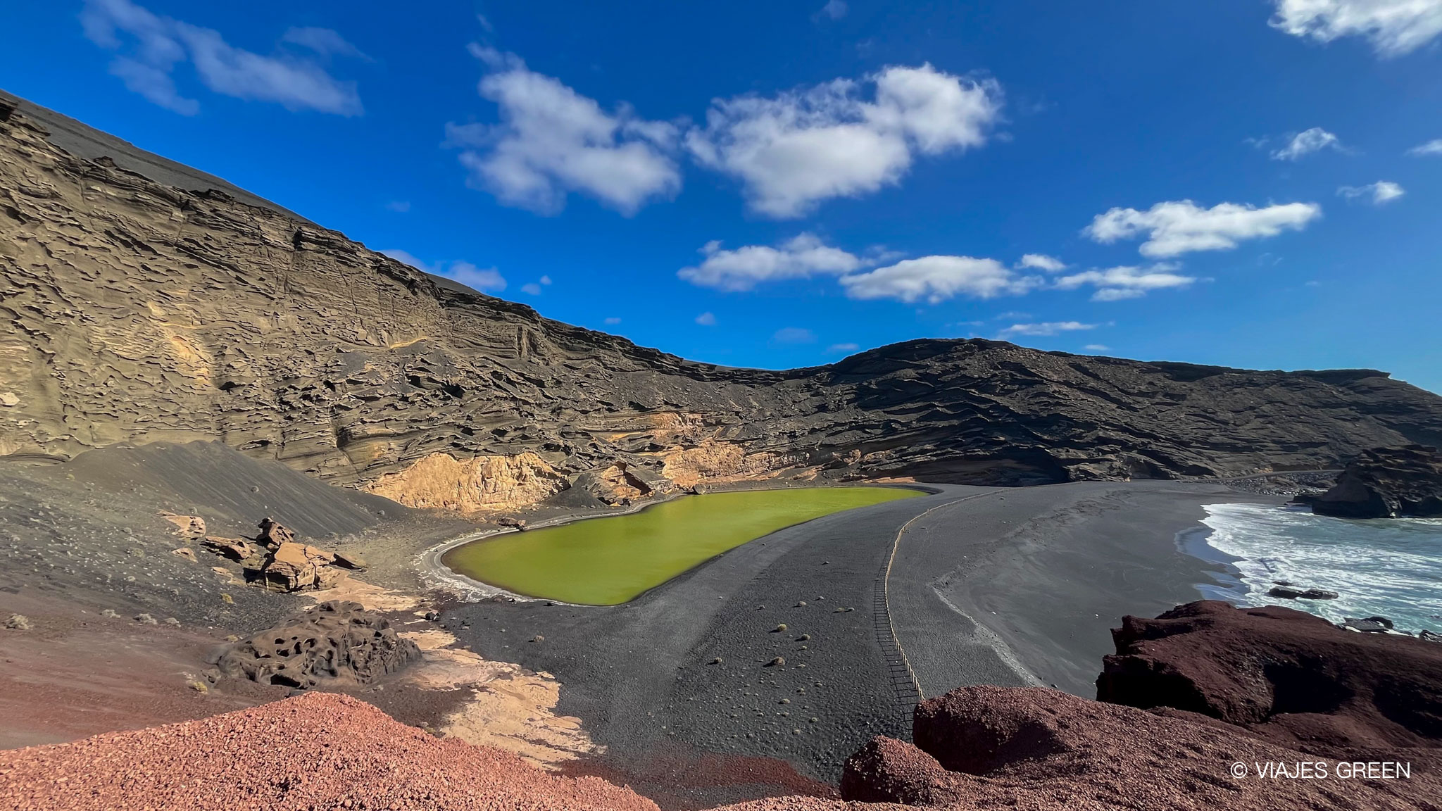 Después de la visita a una de las bodegas más famosas de Lanzarote, fuimos a explorar la zona de El Golfo. Allí se encuentra el famoso Charco Verde (Charco de los Clicos), se trata de una laguna de color verde ubicada en el cráter de un volcán escondido en las aguas del Atlantico. El color del agua se debe a las microalgas que anidan en él. Es un lugar bastante turístico, aún así, merece mucho la pena, el contraste de los colores, arena negra, roca volcánica, y el azul del atlántico.